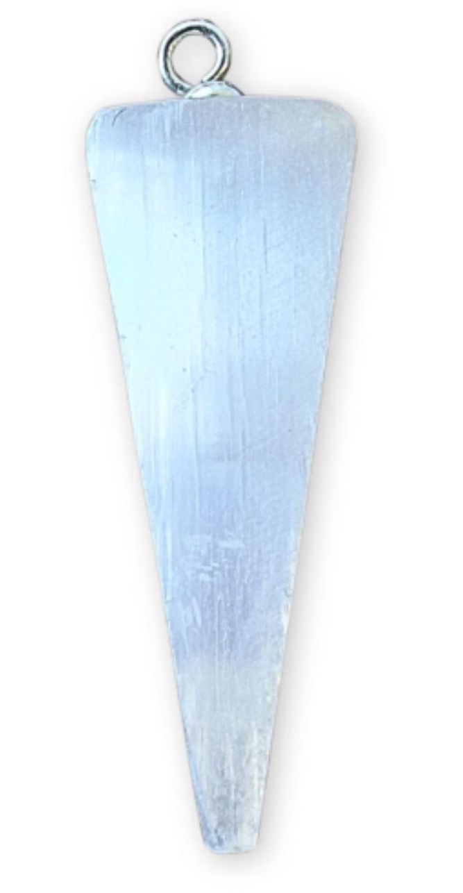 een elegant geslepen hanger van witte Seleniet in puntvorm met